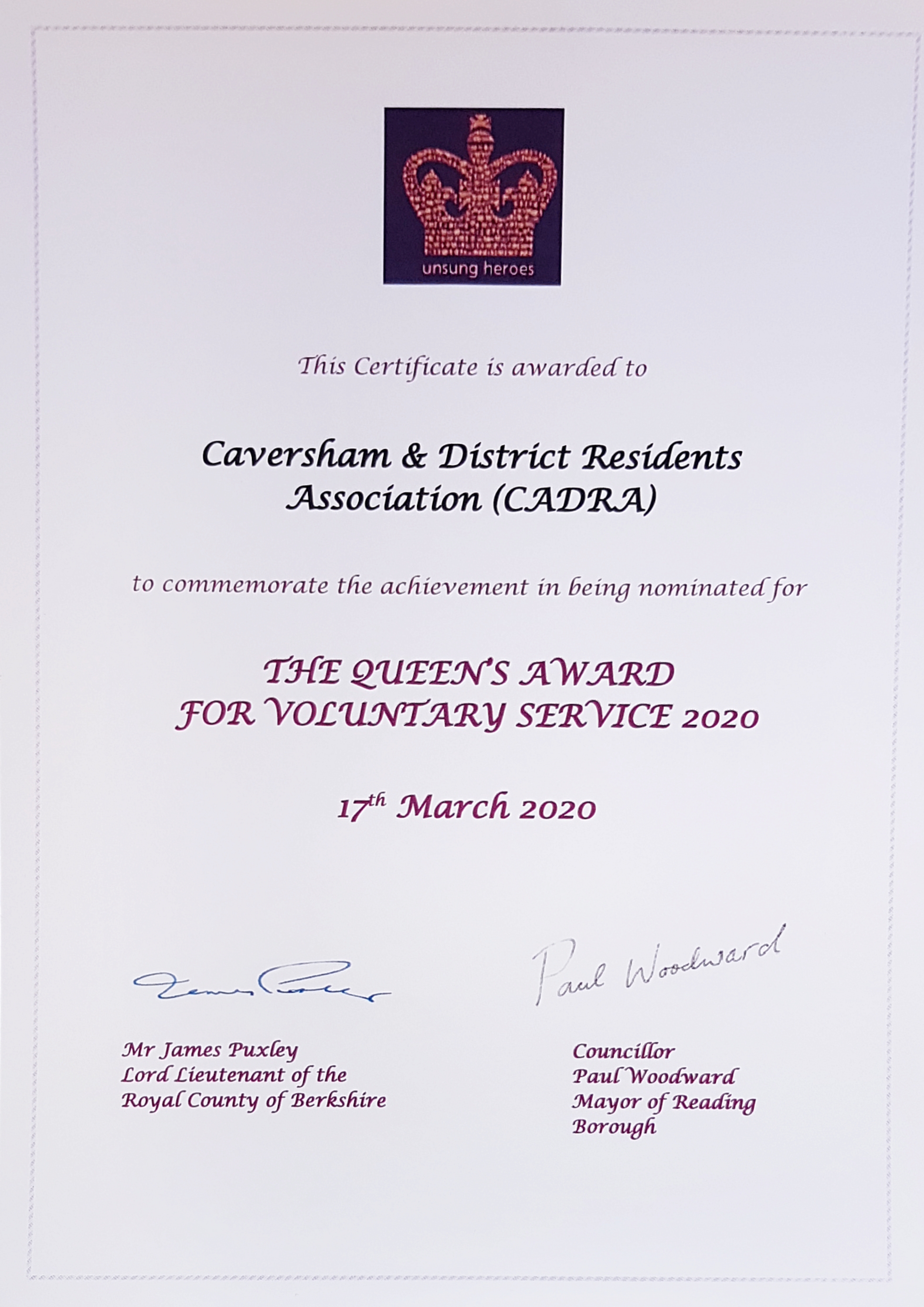 CADRA has been shortlisted for the Queen’s Award for Voluntary Service. This is the highest award given to local volunteer groups across the UK to recognise outstanding work done in their own communities. It was created in 2002 to celebrate the anniversary of The Queen’s coronation – the MBE for volunteer groups. Winners of the 2020 award are expected to be announced later this year, but we feel honoured to have been put forward by the Lord Lieutenant and to have reached this stage. This is the certificate we were awarded for our nomination.